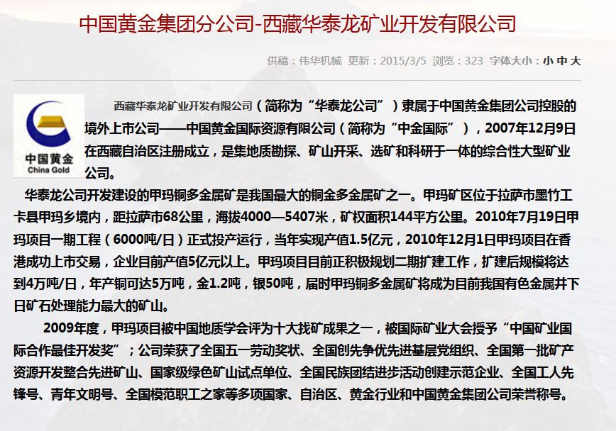 • 合作單位:中國黃金集團分公司-西藏華泰龍礦業開